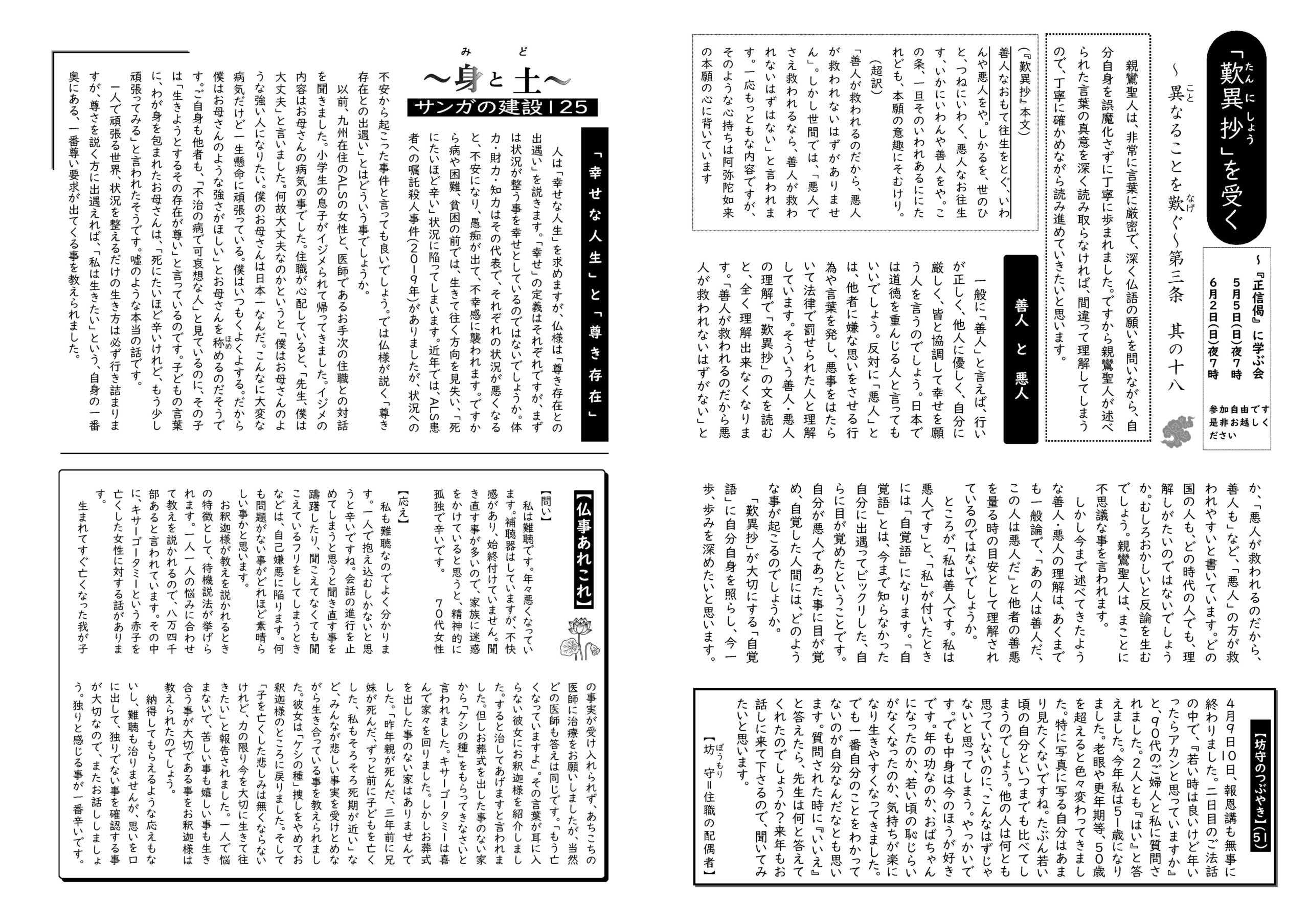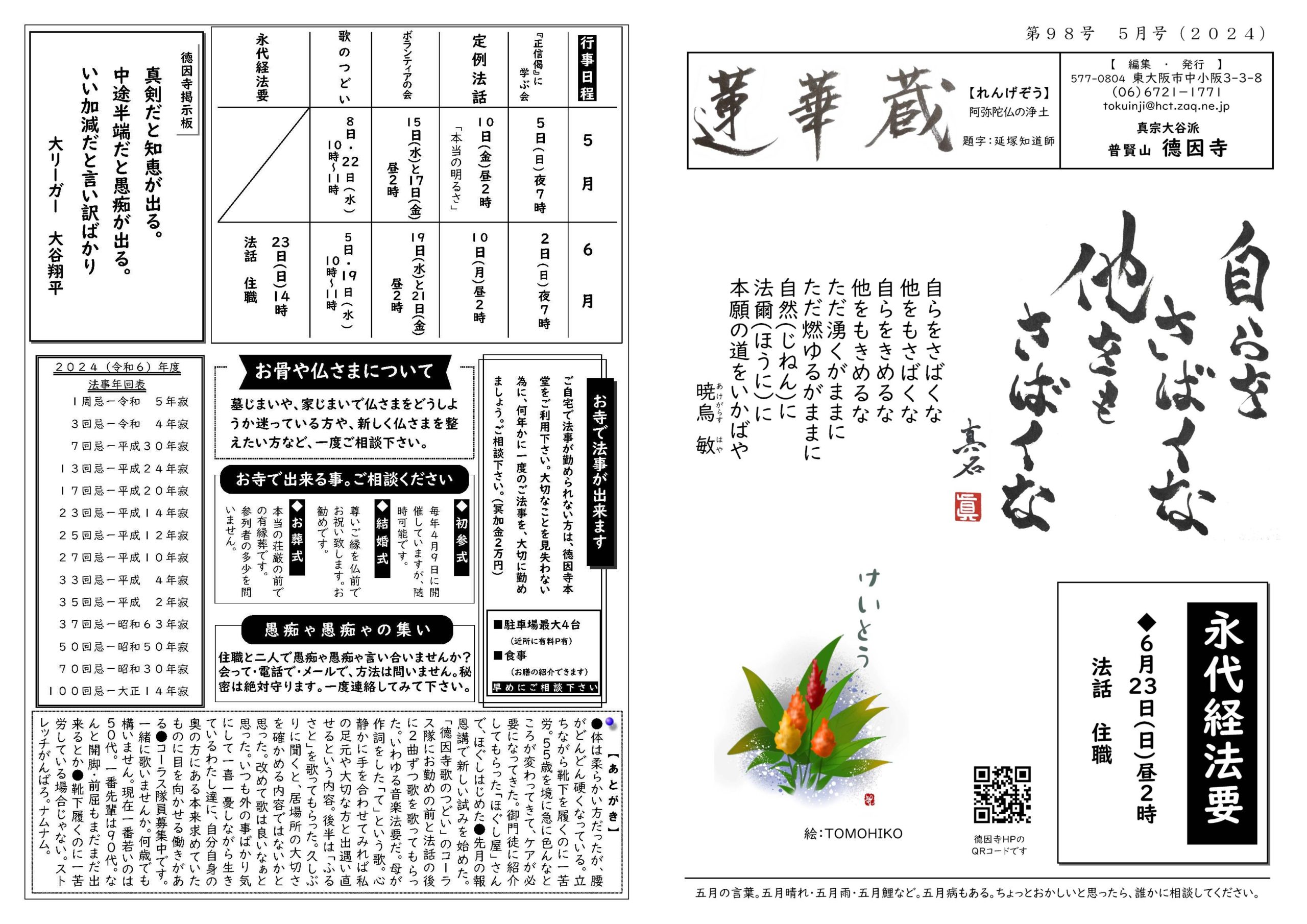 蓮華蔵【れんげぞう】 第98号 5月号(2024年) 2024.5.1 蓮華蔵 自らをさばくな他をもさばくな自らをきめるな他をもきめるなただ湧くがままにただ燃ゆるがままに自然(じねん)に法爾(ほうに)に本願の道をいかばや暁烏敏(あけがらすはや) 各記事のリンク集 歎異抄を受く 坊守のつぶやき 身と土 仏事あれこれ あとがき あとがき(2024年5月) 異なることを歎ぐ 第三条 其の十九 関連記事 第81号 12月号(2022年) 第115号 10月号(2025年) 第113号 8月号(2025年) 第111号 6月号(2025年) 第82号 1月号(2023年) 第110号 5月号(2025年)