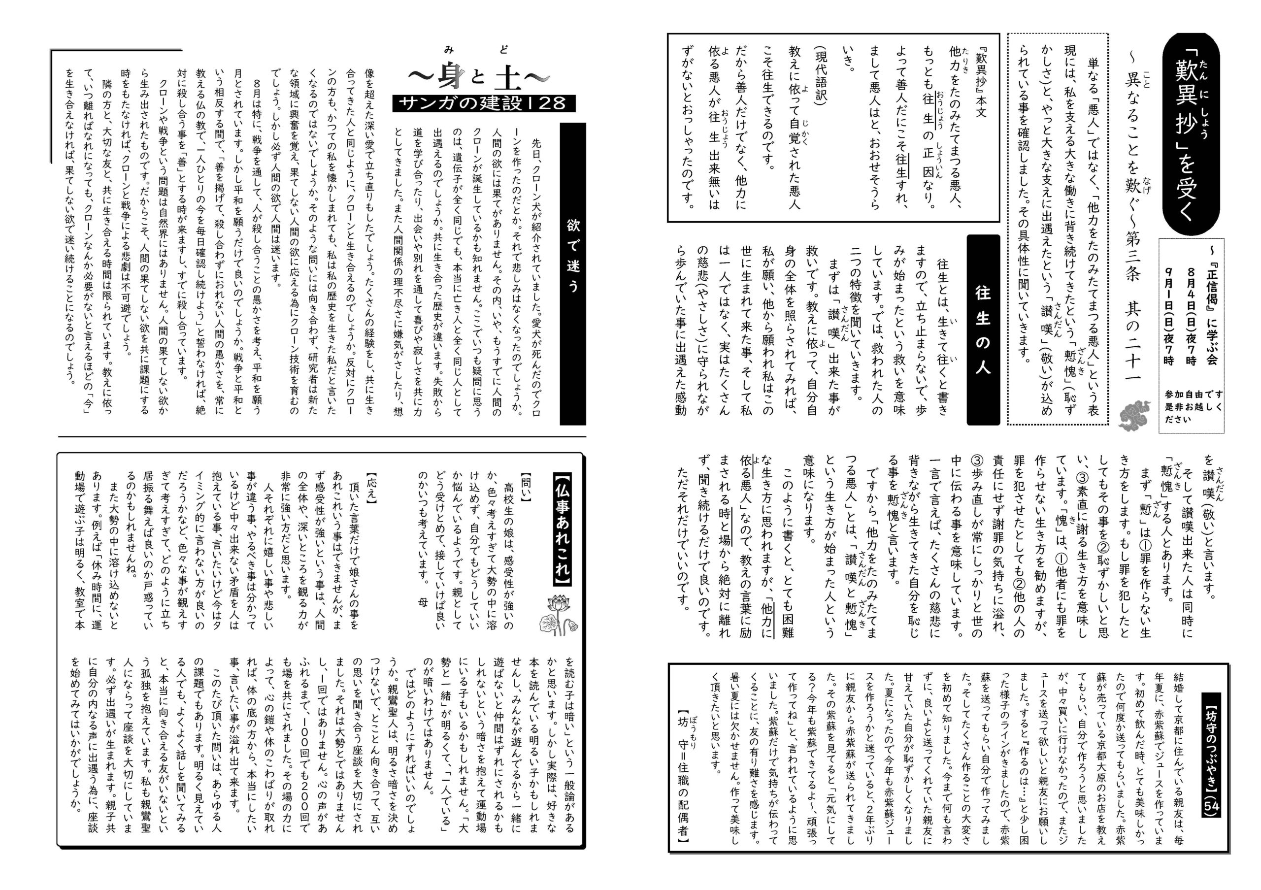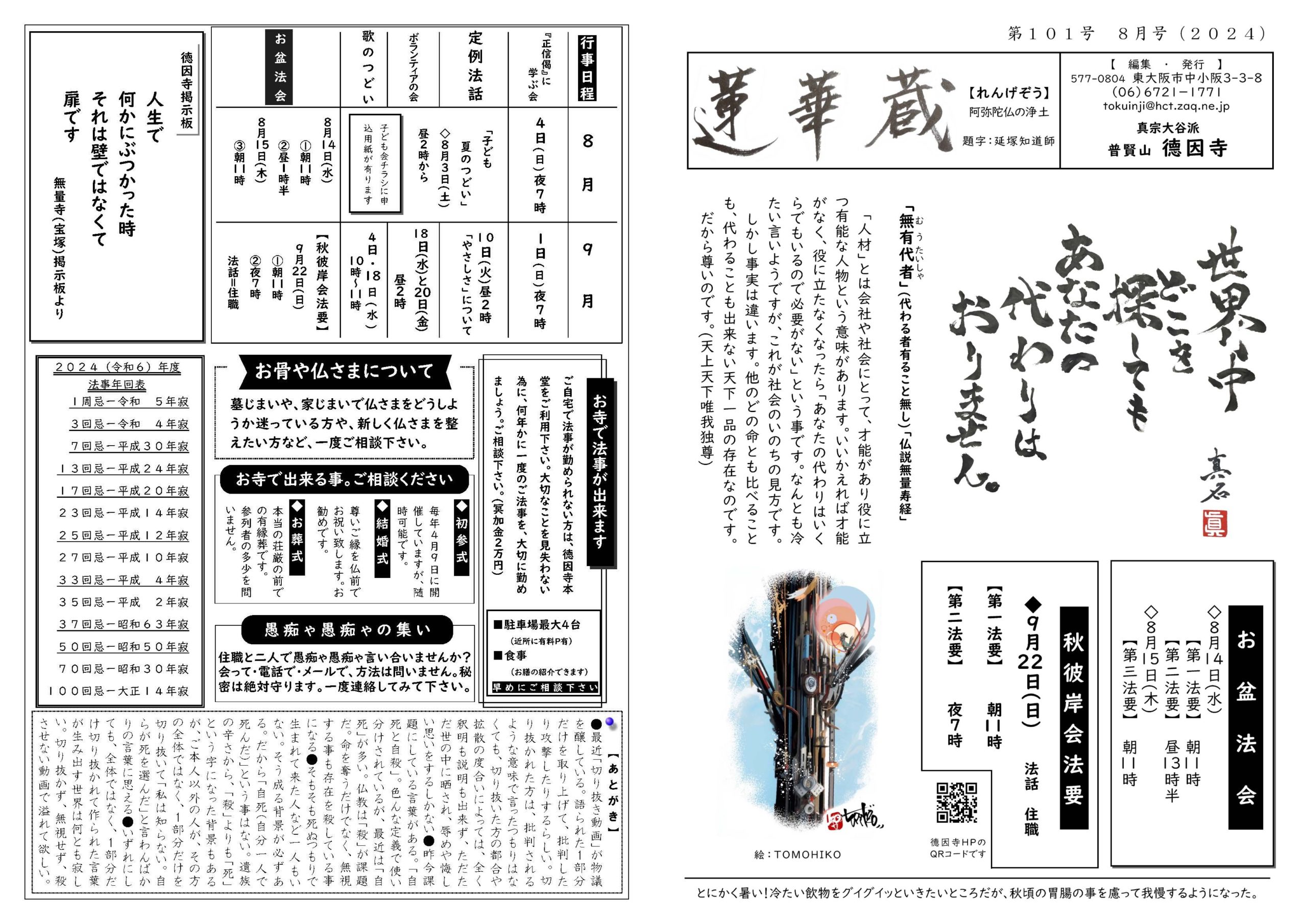 蓮華蔵【れんげぞう】 第101号 8月号(2024年) 2024.8.1 蓮華蔵 「無有代者」(代わる者有ること無し)「仏説無量寿経」「人材」とは会社や社会にとって、才能があり役に立つ有能な人物という意味があります。いいかえれば才能がなく、役に立たなくなったら「あなたの代わりはいくらでもいるので必要がない」という事です。なんとも冷たい言いようですが、これが社会のいのちの見方です。しかし事実は違います。他のどの命とも比べることも、代わることも出来ない天下一品の存在なのです。だから尊いのです。(天上天下唯我独尊) 各記事のリンク集 歎異抄を受く 坊守のつぶやき 身と土 仏事あれこれ あとがき あとがき(2024年8月) 異なることを歎ぐ 第四条 其の二十二 関連記事 第112号 7月号(2025年) 第93号 12月号(2023年) 第102号 9月号(2024年) 第97号 4月号(2024年) 第94号 1月号(2024年) 第89号 8月号(2023年)