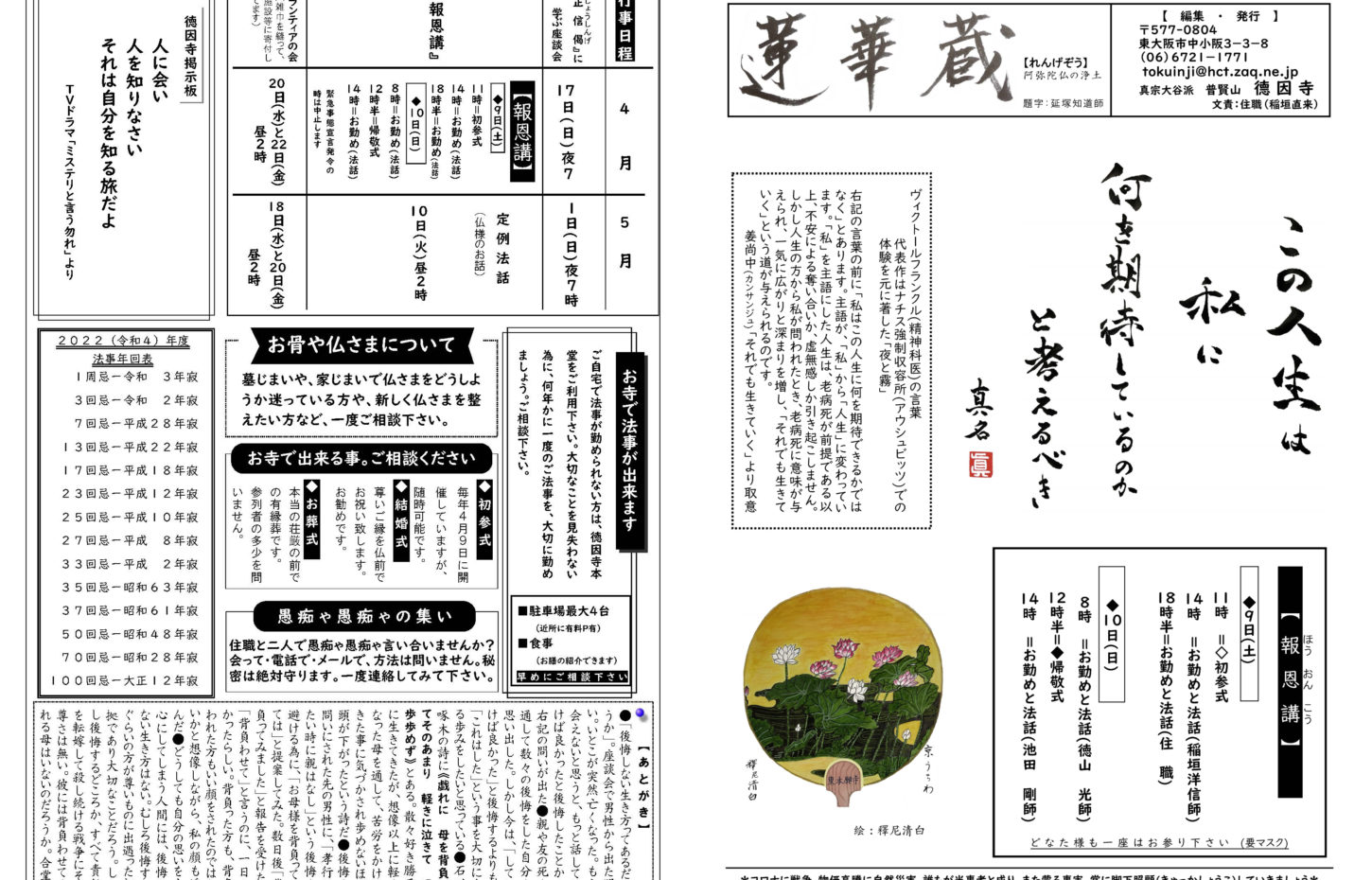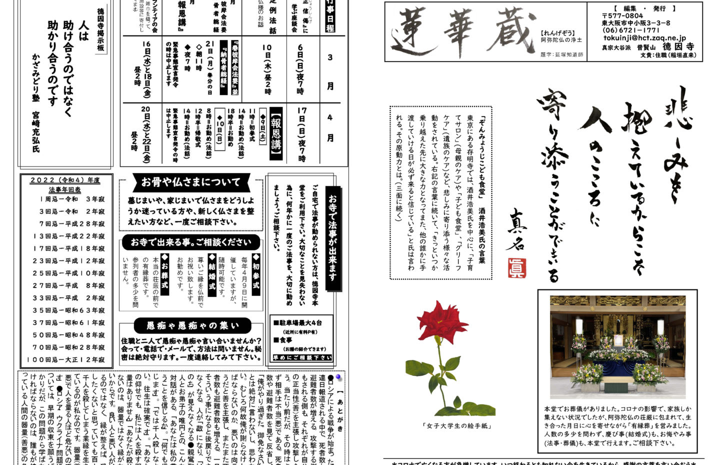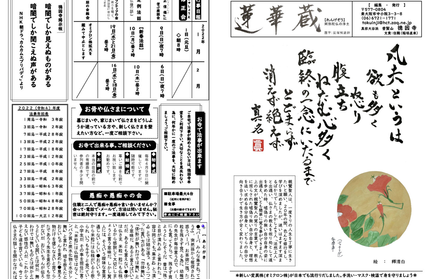 蓮華蔵【れんげぞう】 第110号 5月号(2025年) 2025.5.1 蓮華蔵 朝ドラ「あんぱん」のセリフより内容は「アンパンマン」を生み出した、やなせたかしと暢の夫婦がモデルで、生きる意味を失っていた苦悩の日々と、それでも夢を忘れなかった二人の人生物語。右記の言葉は、「アンパンマン」の主題歌の歌詞にも反映されている。 各記事のリンク集 歎異抄を受く 坊守のつぶやき 身と土 仏事あれこれ あとがき あとがき(2025年5月) 異なることを歎ぐ 第五条 其の三十一 関連記事 第72号 3月号(2022年) 第82号 1月号(2023年) 第80号 11月号(2022年) 第108号 3月号(2025年) 第70号 1月号(2022年) 第88号 7月号(2023年)