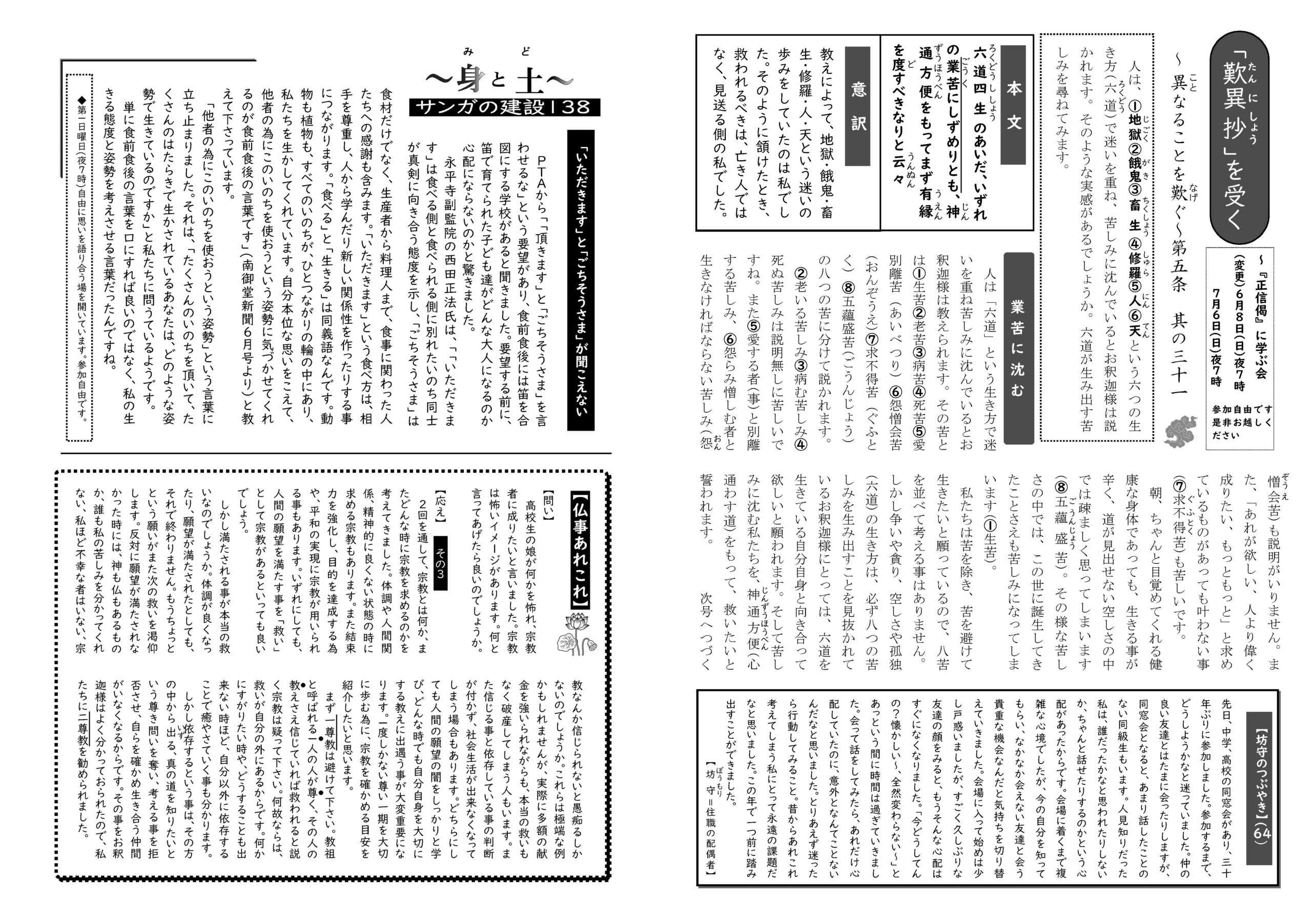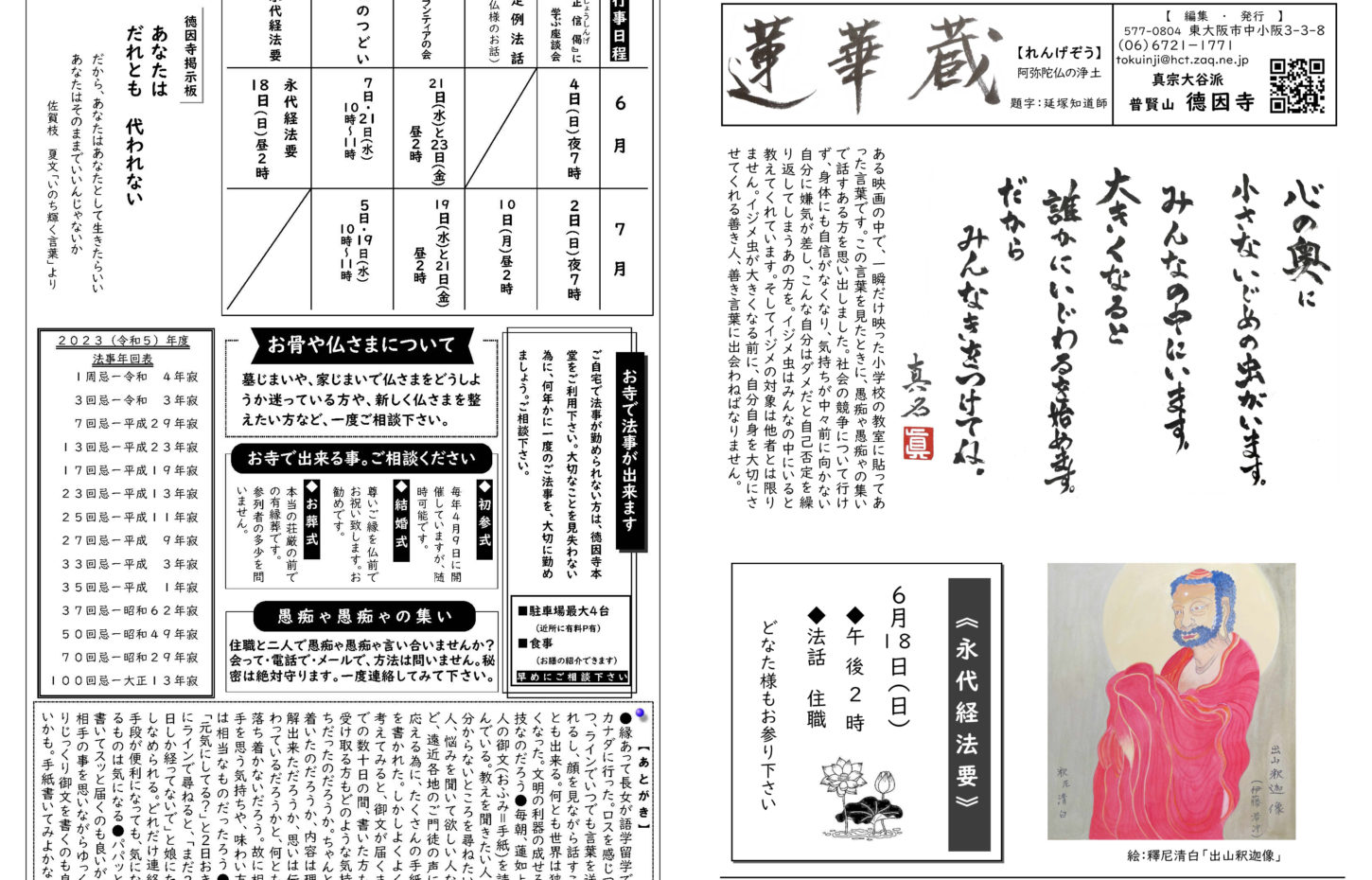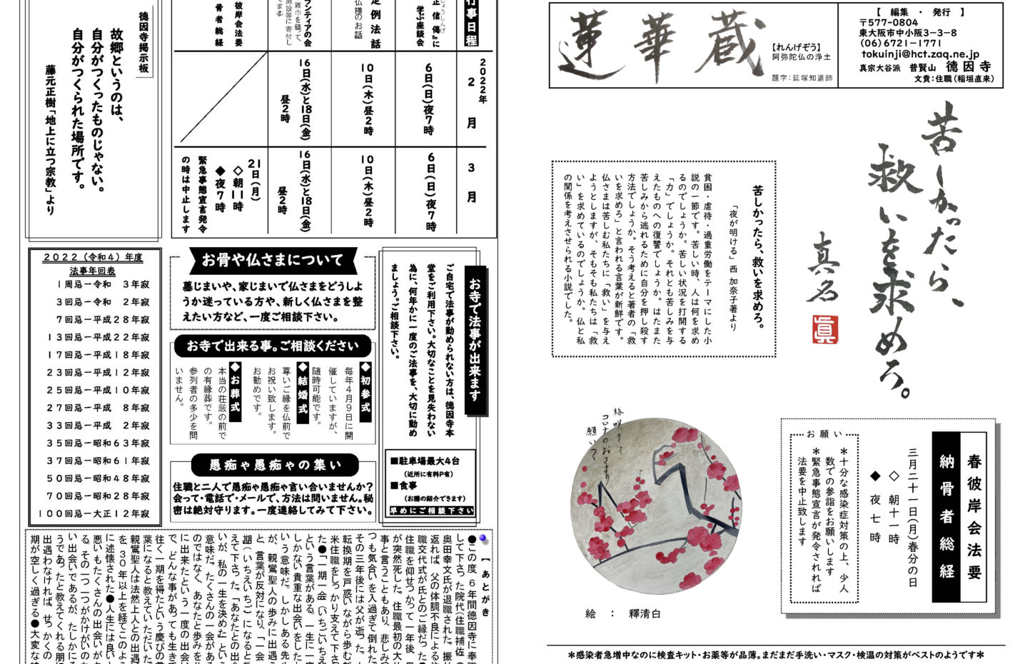 蓮華蔵【れんげぞう】 第111号 6月号(2025年) 2025.6.1 蓮華蔵 今、頑張って「あるく」ことが出来ているとしたら、ひりぼっちでない。今、頑張れていないとしたら、誰ともつながれてない一人かもしれない。人は、誰にも代わってもらえない独りを生きなければならないが、一人で生きてはいけない。善き人・善き言葉と出遇う事を心から念じます*右記の言葉は榎本栄一氏(真宗大谷派難波別院『群生海』より) 各記事のリンク集 歎異抄を受く 坊守のつぶやき 身と土 仏事あれこれ あとがき あとがき(2025年6月) 異なることを歎ぐ 第五条 其の三十二 関連記事 第78号 9月号(2022年) 第71号 2月号(2022年) 第70号 1月号(2022年) 第72号 3月号(2022年) 第105号 12月号(2024年) 第112号 7月号(2025年)