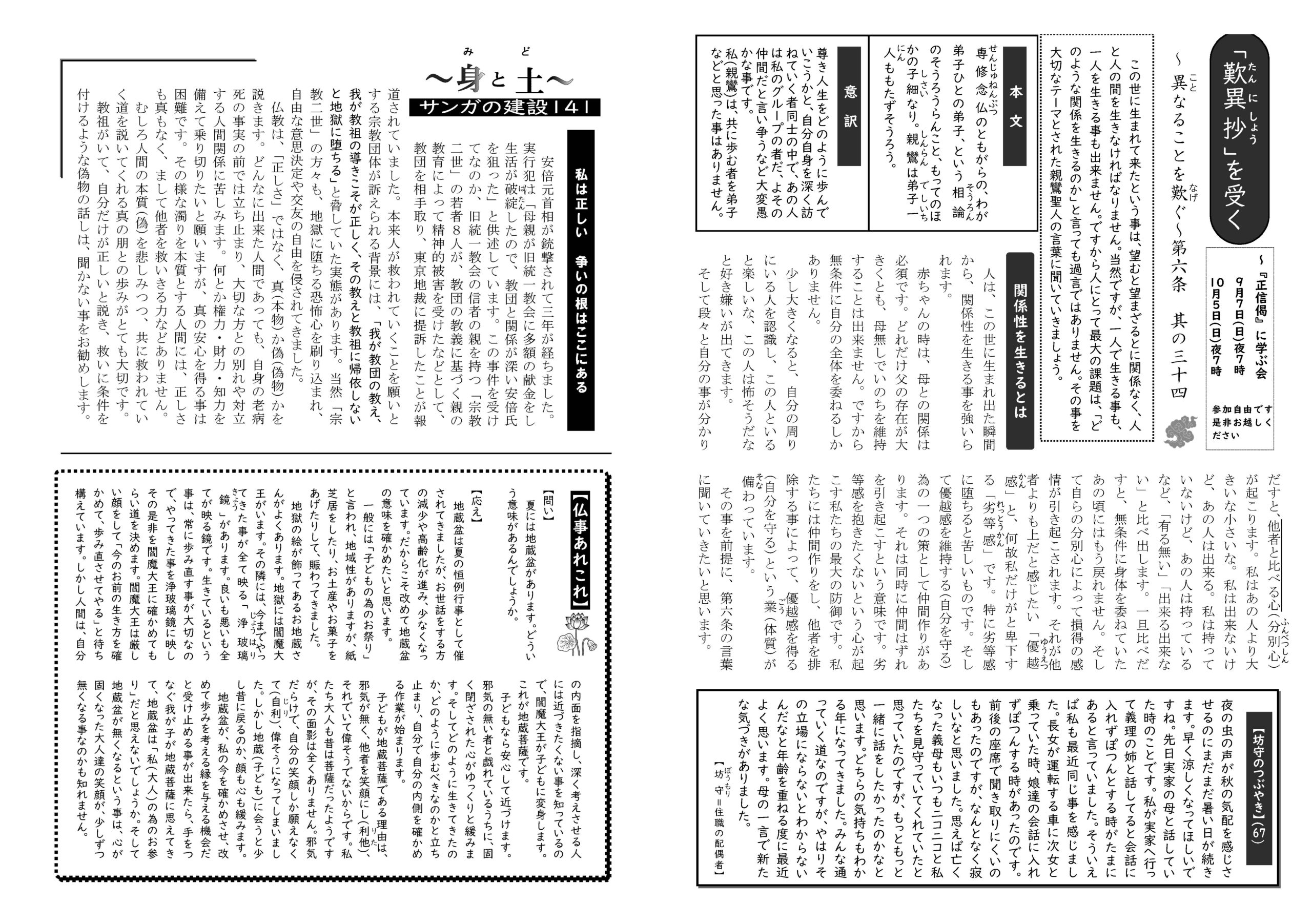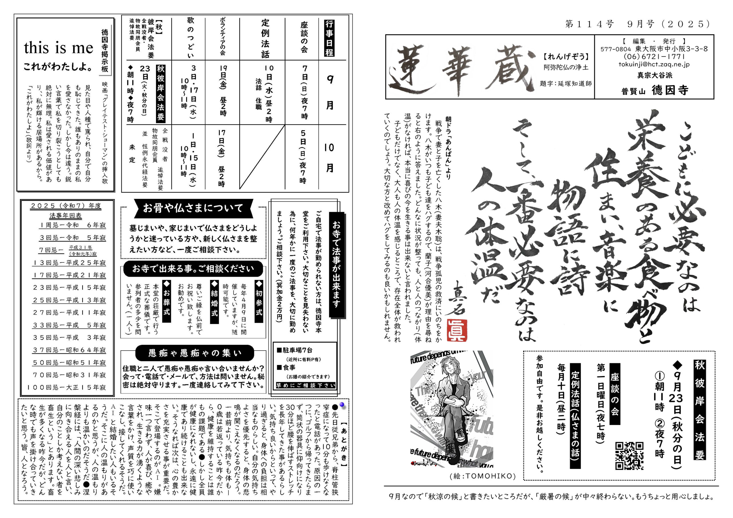 蓮華蔵【れんげぞう】 第114号 9月号(2025年) 2025.9.1 蓮華蔵 朝ドラ「あんぱん」より戦争で妻と子を亡くした八木(妻夫木聡)は、戦争孤児の救済にいのちをかけます。八木がいつも子ども達をハグするので、蘭子(河合優美)が理由を尋ねると右のように答えました。どんなに状況が整っても、人と人のつながり(体温)がなければ、本当に喜びの今を生きる事は出来ないと言われました。子どもだけでなく、大人も人の体温を感じるところで、存在全体が救われていくのでしょう。大切な方と改めてハグをしてみるのも良いかもしれません。 各記事のリンク集 歎異抄を受く 坊守のつぶやき 身と土 仏事あれこれ あとがき あとがき(2025年9月) 異なることを歎ぐ 第六条 其の三十五 関連記事 第104号 11月号(2024年) 第119号 2月号(2026年) 第84号 3月号(2023年) 第81号 12月号(2022年) 第100号 7月号(2024年) 第108号 3月号(2025年)