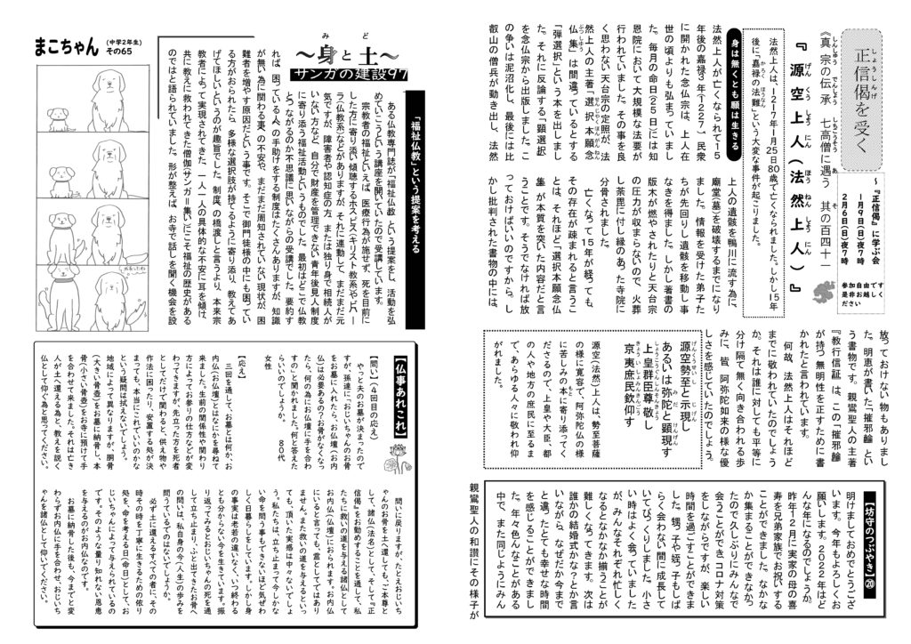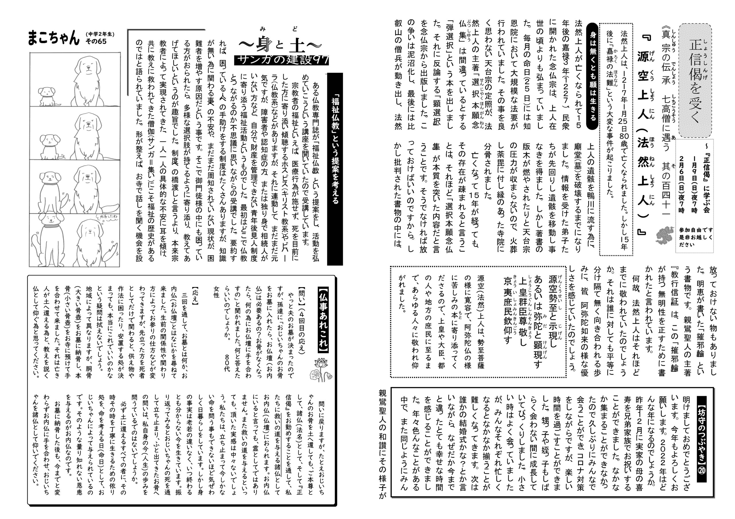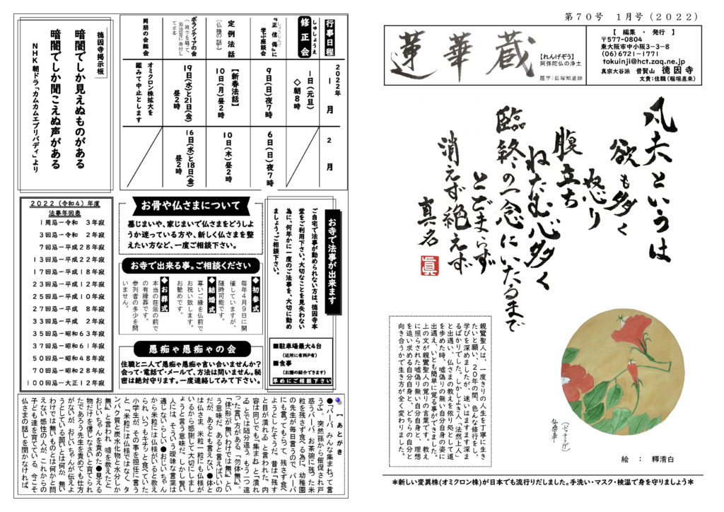 蓮華蔵【れんげぞう】 第70号 1月号(2022年) 2022.1.1 蓮華蔵 親鸞聖人は、一度きりの人生を丁寧に生きたいと願い、20年の間、色んな修行をし、学びを深めましたが、迷いはますます深まるばかりでした。しかしよき人「法然上人」と出遇い、仏さまの教えを依り処として道を歩めた時、嘘偽りの無い自分自身の姿に出遇え、いとも簡単に覚る事ができました。上の文が親鸞聖人の覚りの言葉です。教えに照らされた嘘偽り無い自分自身と、理想を追い求める自分自身と、どちらの自分と向き合うかで生き方が全く変わりました。 各記事のリンク集 正信偈を受く 坊守のつぶやき 身と土 仏事あれこれ あとがき あとがき(2022年1月) 真宗の伝承 七高僧に遇う 其の百四十一 関連記事 第110号 5月号(2025年) 第79号 10月号(2022年) 第108号 3月号(2025年) 第90号 9月号(2023年) 第85号 4月号(2023年) 第99号 6月号(2024年)