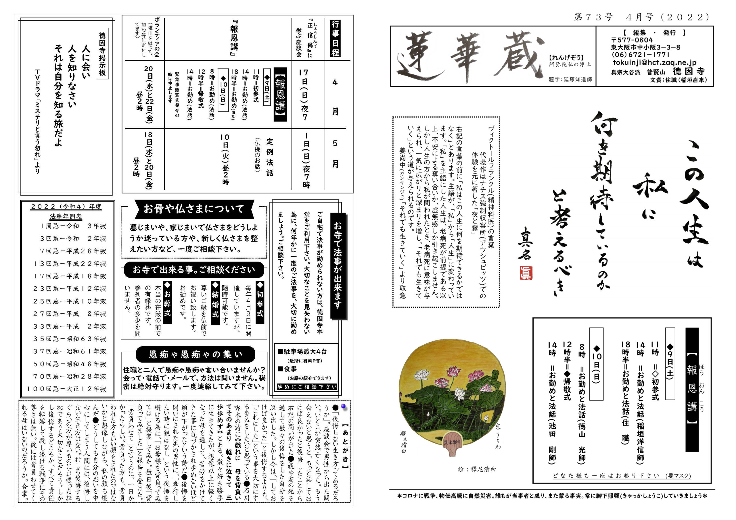 右記の言葉の前に「私はこの人生に何を期待できるかではなく」とあります。主語が、「私」から「人生」に変わっています。「私」を主語にした人生は、老病死が前提である以上、不安による奪い合いか、虚無感しか引き起こしません。しかし人生の方から私が問われたとき、老病死に意味が与えられ、一気に広がりと深まりを増し、「それでも生きていく」という道が与えられるのです。