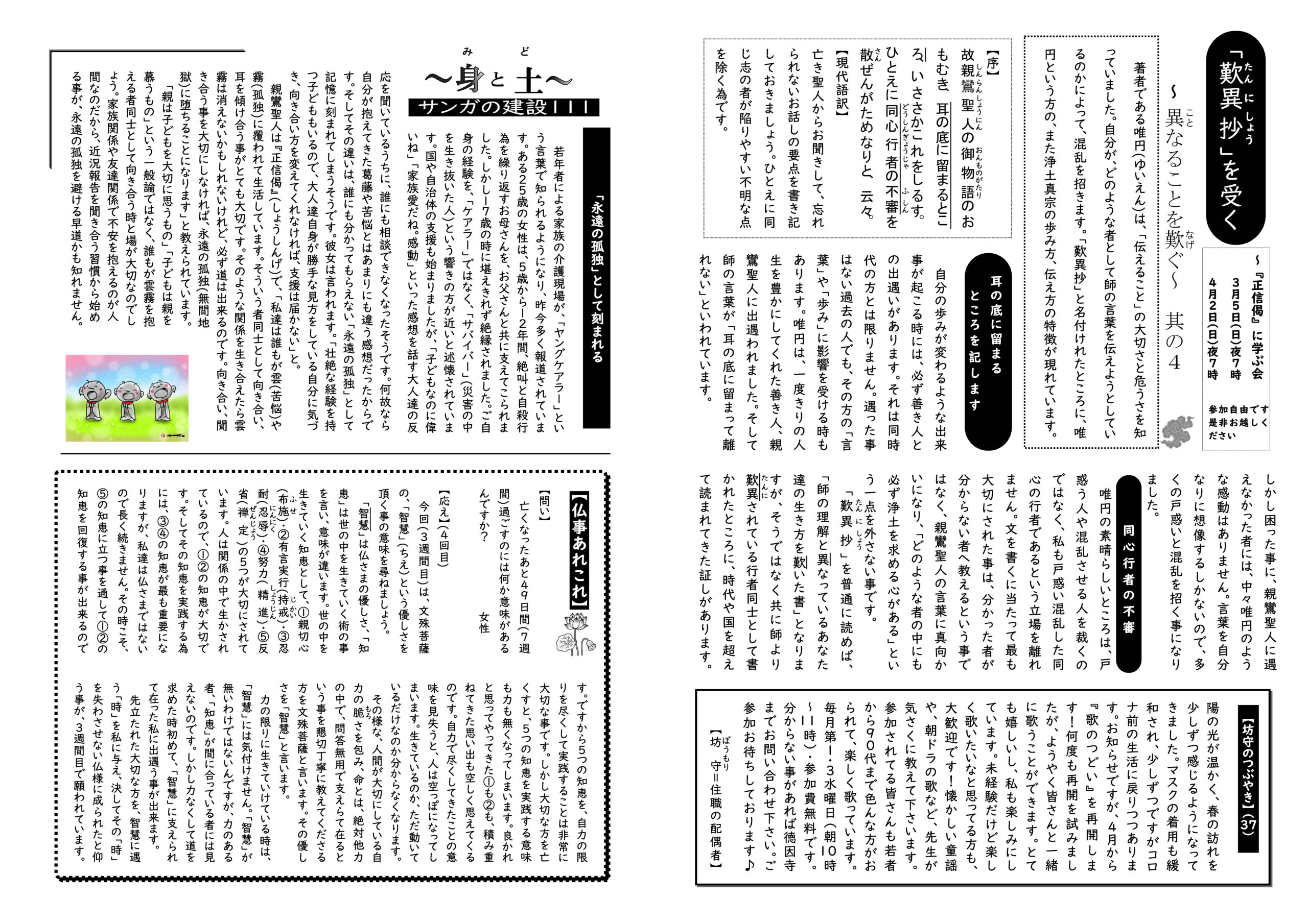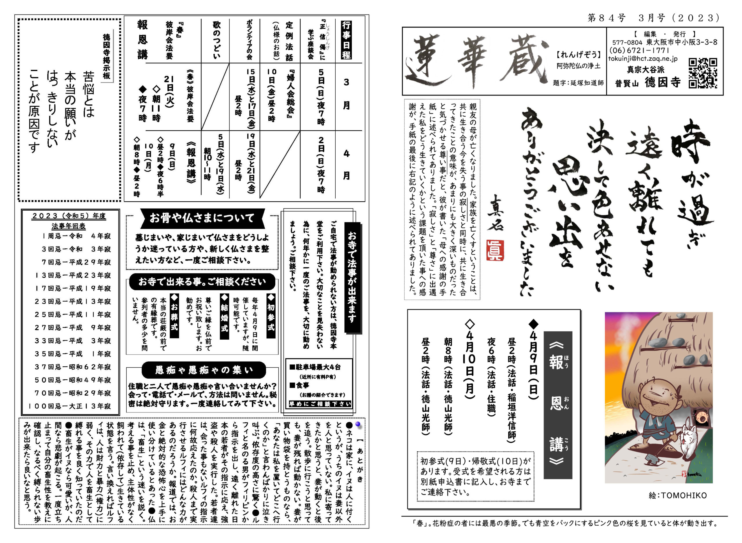 蓮華蔵【れんげぞう】 第84号 3月号(2023年) 2023.3.1 蓮華蔵 親友の母が亡くなりました。家族を亡くすということは、共に生き合う今を失う事の寂しさと同時に、共に生き合ってきたことの意味が、あまりにも大きく深いものだったと気づかせる尊い事だと、彼が書いた「母への感謝の手紙」に述べられてありました。「寂しさ」と「尊さ」に出遇えた私をどう生きていくかという課題を頂いた事への感謝が、手紙の最後に左記のように述べられてありました。 各記事のリンク集 正信偈を受く 坊守のつぶやき 身と土 仏事あれこれ あとがき あとがき(2023年3月) 異なることを歎ぐ 其の5 関連記事 第91号 10月号(2023年) 第111号 6月号(2025年) 第114号 9月号(2025年) 第115号 10月号(2025年) 第99号 6月号(2024年) 第85号 4月号(2023年)