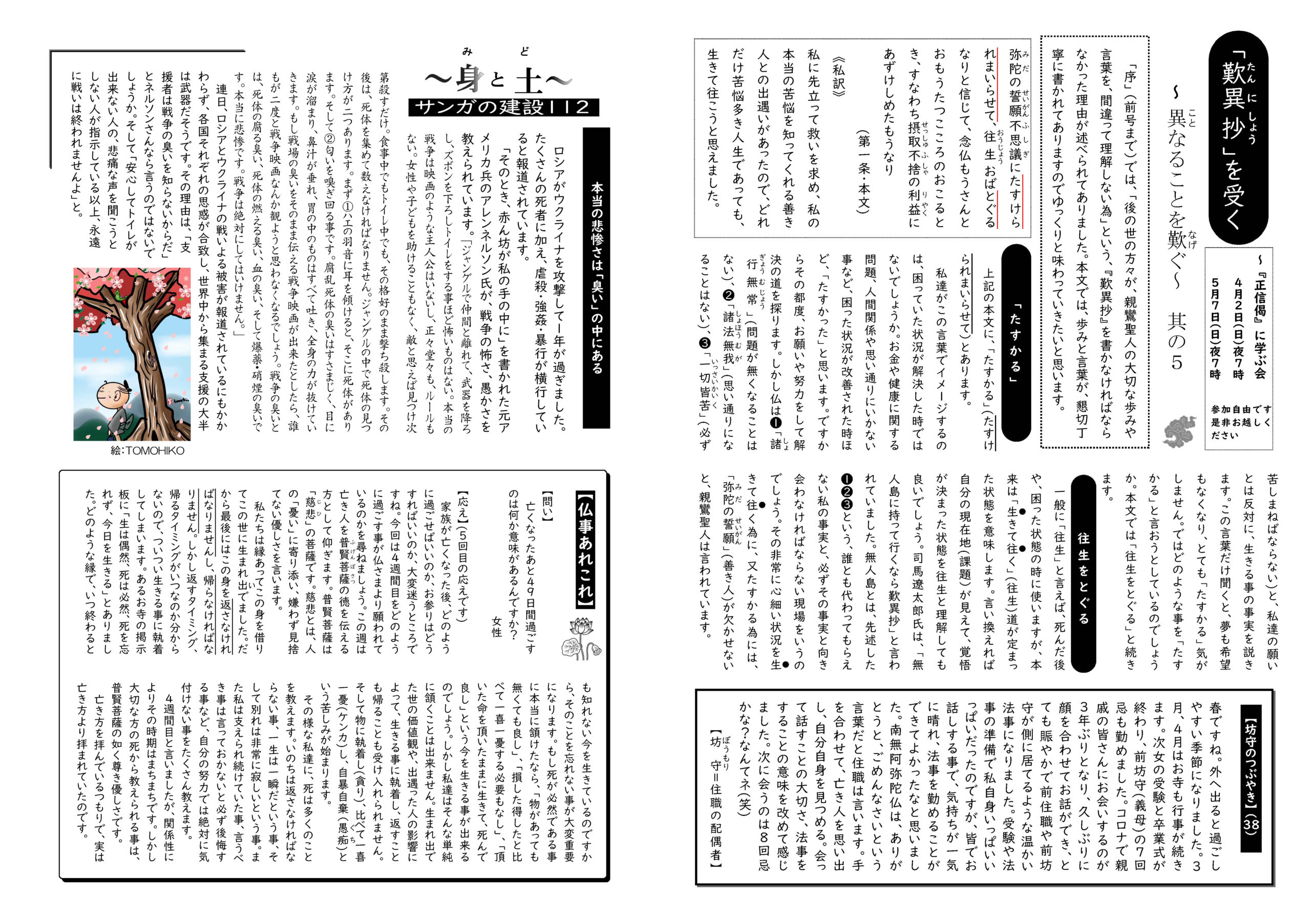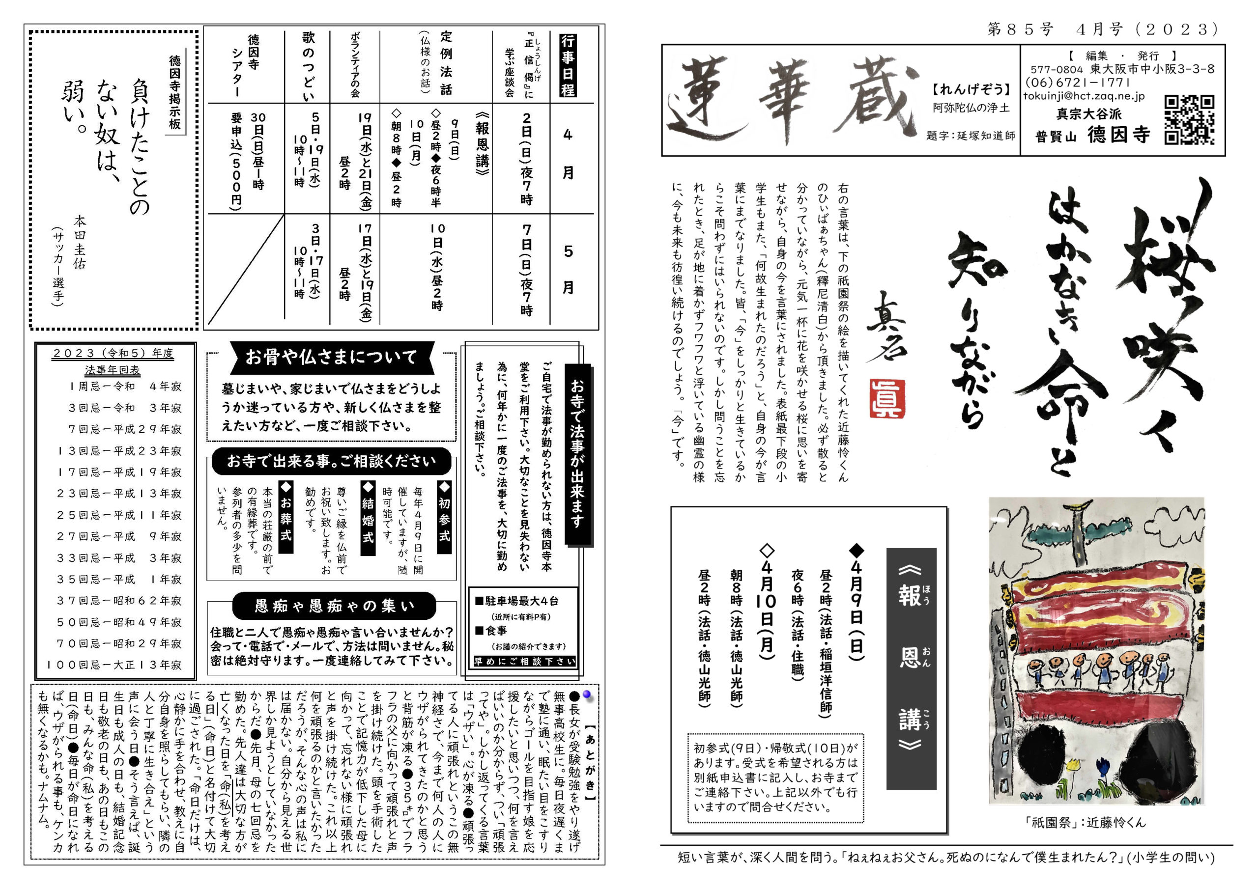 蓮華蔵【れんげぞう】 第85号 4月号(2023年) 2023.4.1 蓮華蔵 右の言葉は、下の祇園祭の絵を描いてくれた近藤怜くんのひぃばぁちゃん(釋尼清白)から頂きました。必ず散ると分かっていながら、元気一杯に花を咲かせる桜に思いを寄せながら、自身の今を言葉にされました。表紙最下段の小学生もまた、「何故生まれたのだろう」と、自身の今が言葉にまでなりました。皆、「今」をしっかりと生きているからこそ問わずにはいられないのです。しかし問うことを忘れたとき、足が地に着かずフワフワと浮いている幽霊の様に、今も未来も彷徨い続けるのでしょう。「今」です。 各記事のリンク集 正信偈を受く 坊守のつぶやき 身と土 仏事あれこれ あとがき あとがき(2023年4月) 異なることを歎ぐ 其の6 関連記事 第117号 12月号(2025年) 第111号 6月号(2025年) 第114号 9月号(2025年) 第90号 9月号(2023年) 第101号 8月号(2024年) 第99号 6月号(2024年)