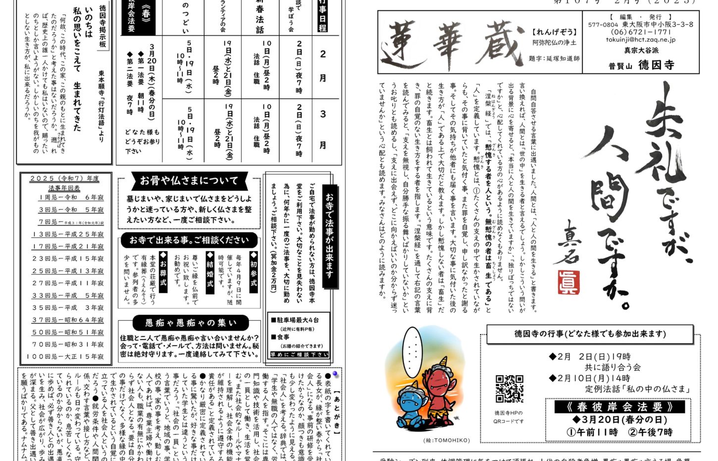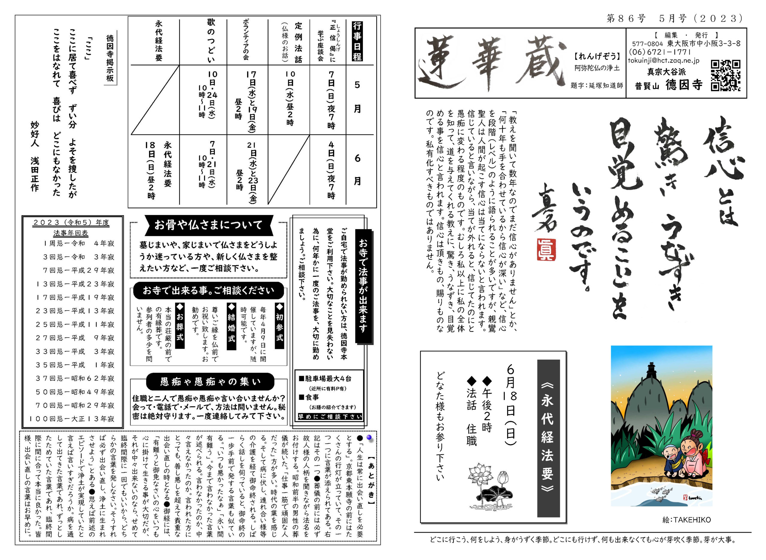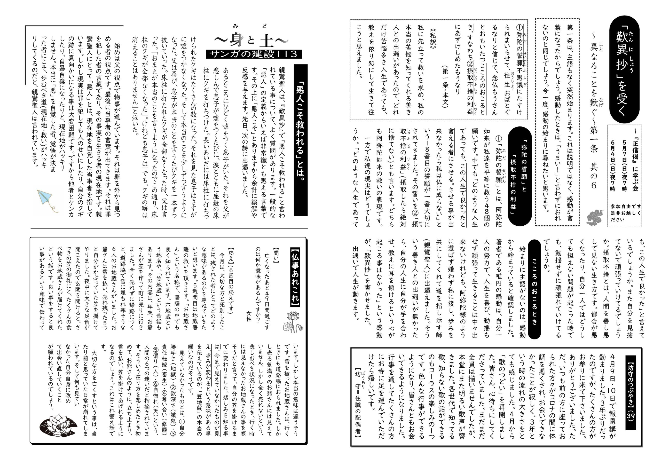 蓮華蔵【れんげぞう】 第86号 5月号(2023年) 2023.5.1 蓮華蔵 「教えを聞いて数年なのでまだ信心がありません」とか、「何十年も手を合わせているから信心が深い」など、信心を段階(レベル)のように語られることが多いですが、親鸞聖人は人間が起こす信心は当てにならないと言われます。信じていると言いながら、当てが外れると、信じてたのにと愚痴に変わる程度のものです。むしろ私以上に私の全体を知って、道を与えてくれる教えに、驚き、うなずき、目覚める事を信心と言われます。信心は頂きもの、賜りものなのです。私有化すべきものではありません。 各記事のリンク集 正信偈を受く 坊守のつぶやき 身と土 仏事あれこれ あとがき あとがき(2023年5月) 異なることを歎ぐ 其の7 関連記事 第104号 11月号(2024年) 第98号 5月号(2024年) 第113号 8月号(2025年) 第107号 2月号(2025年) 第97号 4月号(2024年) 第70号 1月号(2022年)