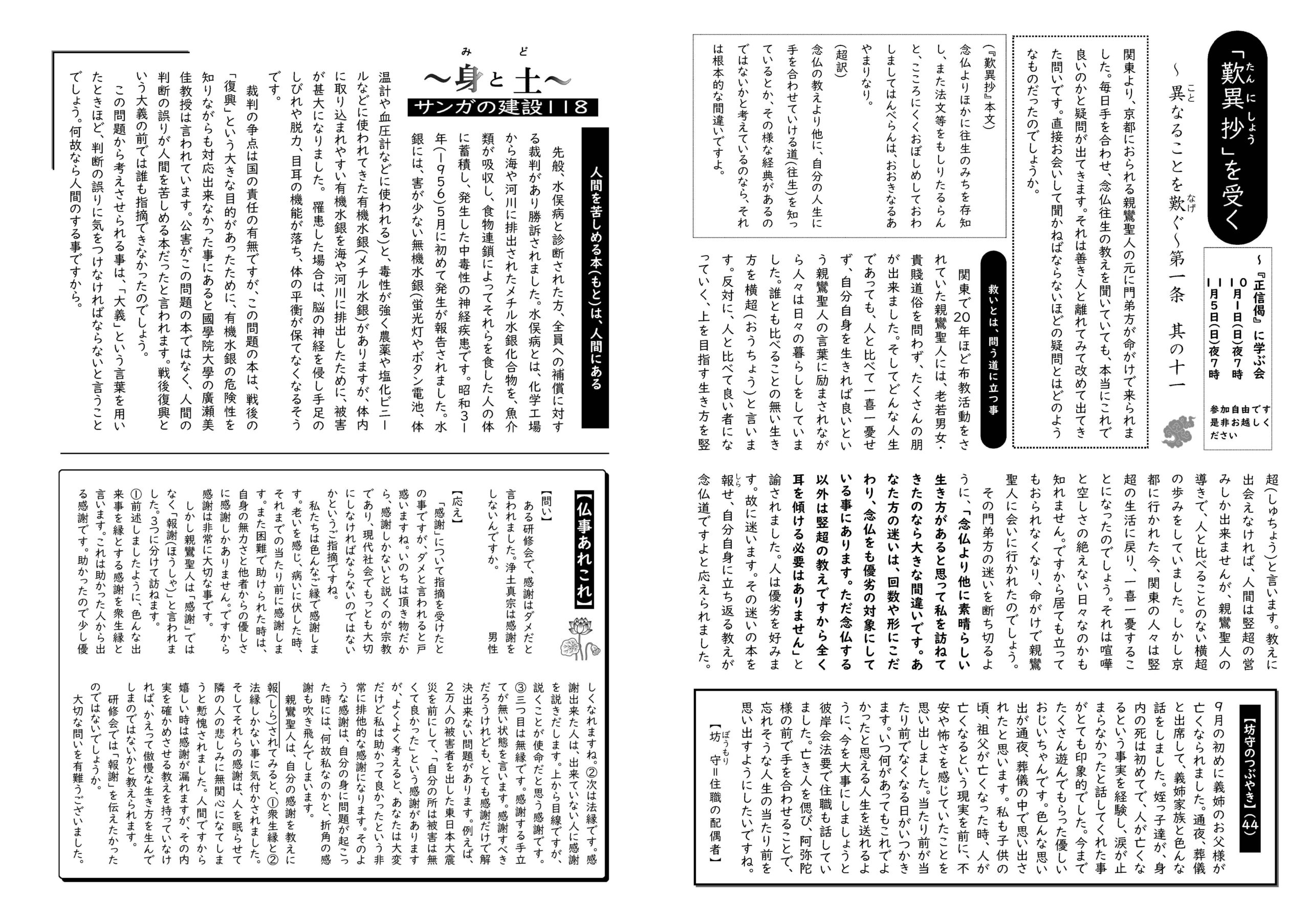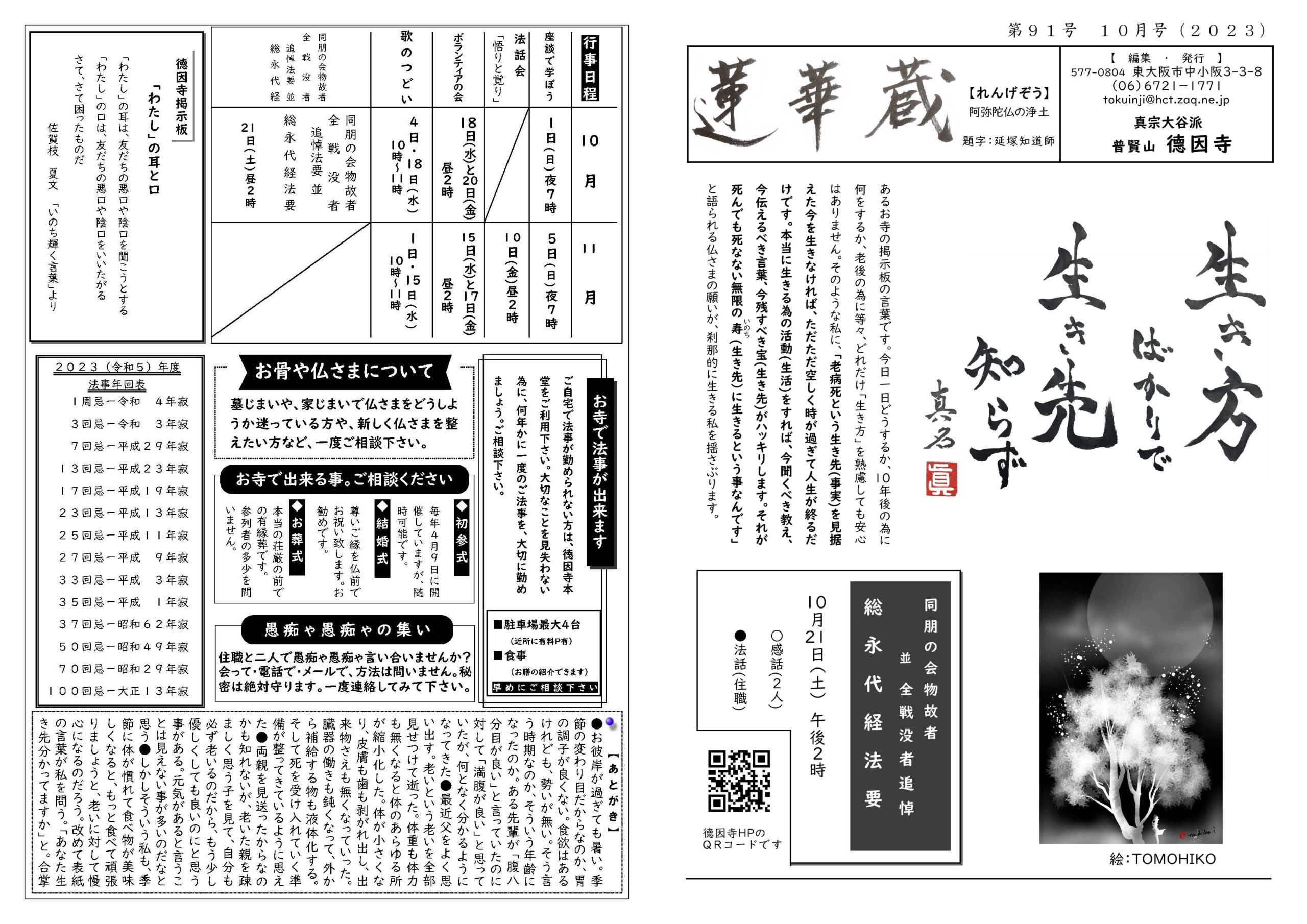 蓮華蔵【れんげぞう】 第91号 10月号(2023年) 2023.10.1 蓮華蔵 あるお寺の掲示板の言葉です。今日一日どうするか、10年後の為に何をするか、老後の為に等々、どれだけ「生き方」を熟慮しても安心はありません。そのような私に、「老病死という生き先(事実)を見据えた今を生きなければ、ただただ空しく時が過ぎて人生が終るだけです。本当に生きる為の活動(生活)をすれば、今聞くべき教え、今伝えるべき言葉、今残すべき宝(生き先)がハッキリします。それが死んでも死なない無限の寿(生き先)に生きるという事なんです」と語られる仏さまの願いが、刹那的に生きる私を揺さぶります。 各記事のリンク集 正信偈を受く 坊守のつぶやき 身と土 仏事あれこれ あとがき あとがき(2023年10月) 異なることを歎ぐ 第二条 其の十二 関連記事 第110号 5月号(2025年) 第109号 4月号(2025年) 第98号 5月号(2024年) 第78号 9月号(2022年) 第71号 2月号(2022年) 第115号 10月号(2025年)