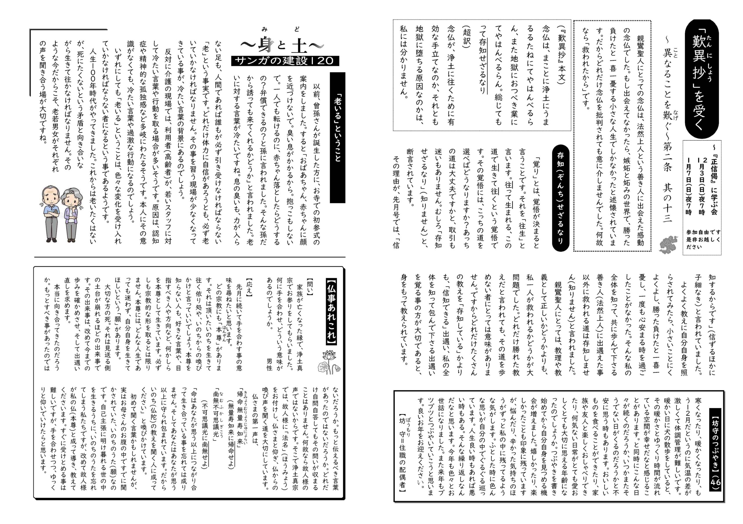 蓮華蔵【れんげぞう】 第93号 12月号(2023年) 2023.12.1 蓮華蔵 悲しいことはない方が良い。楽しい事だけで過ごせたら良い。しかしいのちの事実は、人間の願いを聞き入れてくれない。老・病・死、愛別離、怨憎会、求不得など、辛くて悲しくて、嫌なことばかりやってくる。しかし辛く悲しい出来事を通した後にしか開かない扉がある。人間の願いだけを願っていた時には開かなかった扉がある。自分よりももっと大きな世界から開かれてくる扉がある。そしてそこに道がある。*宮城顗師の言葉 各記事のリンク集 正信偈を受く 坊守のつぶやき 身と土 仏事あれこれ あとがき あとがき(2023年12月) 異なることを歎ぐ 第二条 其の十四 関連記事 第73号 4月号(2022年) 第88号 7月号(2023年) 第89号 8月号(2023年) 第69号 11月号(2021年) 第78号 9月号(2022年) 第94号 1月号(2024年)