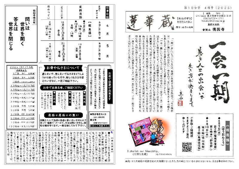 毎月発行のお寺の新聞です。 1面には、住職の気になった言葉を長女に書いてもらい、御門徒様に描いて頂いた絵があり「蓮華蔵」を彩って頂いてます。 2面には、教えの言葉を頂き、「坊守のつぶやき」を載せています。 3面は、世の問題を教えに照らして考えてみる「身と土」と、「仏事あれこれ」(問いと応え)があります。 4面は、お寺の諸行事や、仏語、また住職の日常を綴っています。